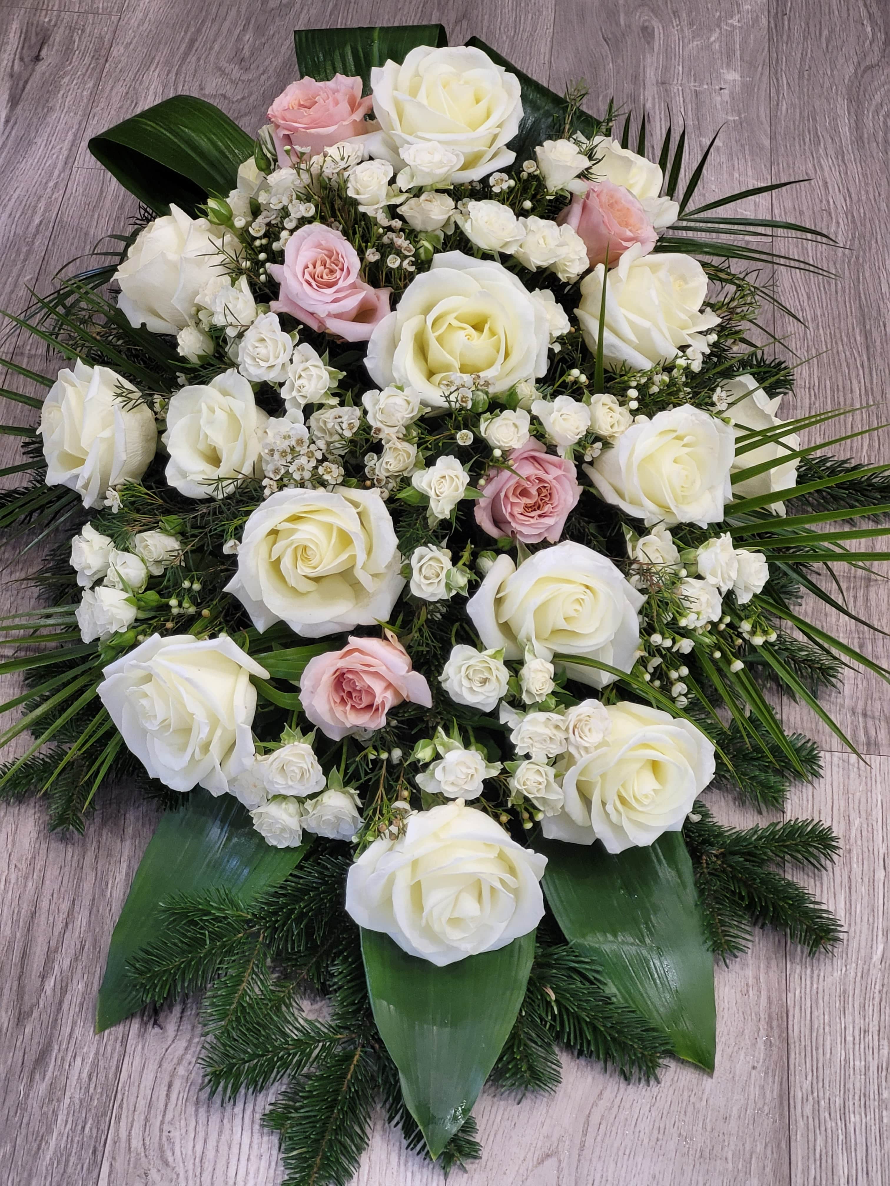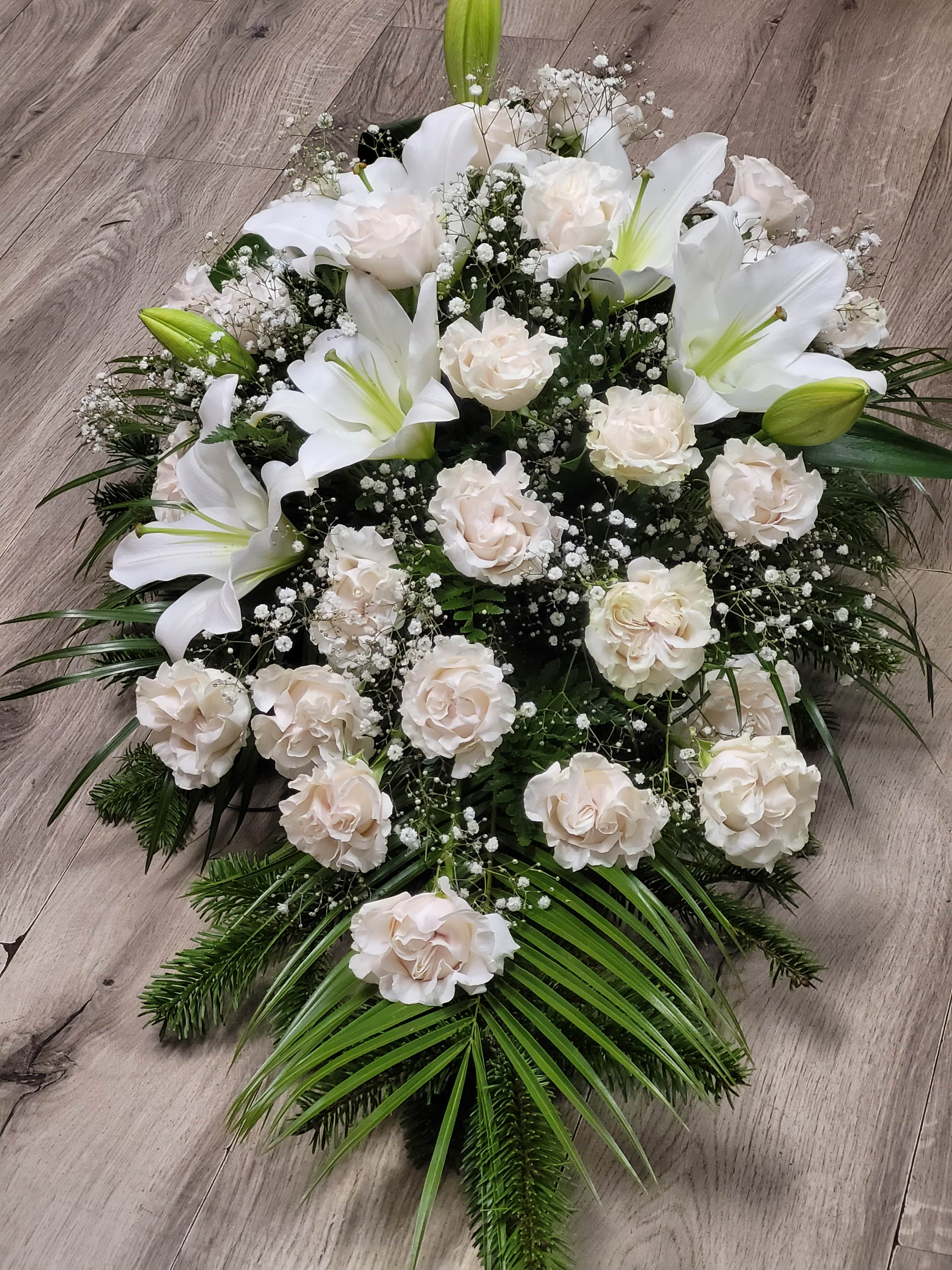 - Wiązanka w mokrej gąbce. Kolorystyka kremowo-biała. Składa się z 10 szt. róż, 5 gałązek eustomy, 5 szt. kalli, podkładu z naturalnej jedliny z dodatkiem liści i gipsówki.