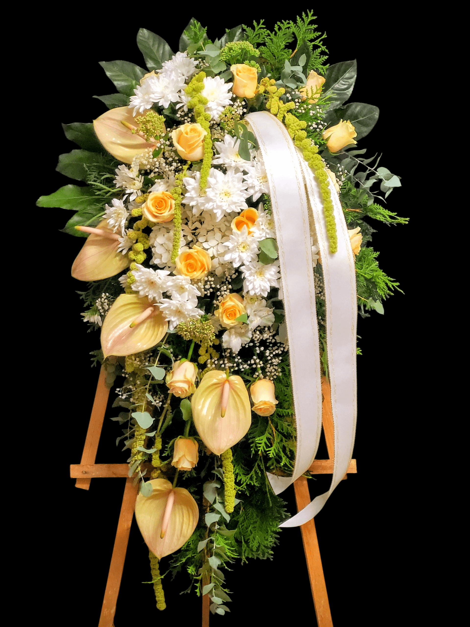 - Wieniec wykonany jest na ringu z mokrej gąbki która dostarcza kwiatom wody. Kolorystyka i dobór kwiatów mogą być inne niż na załączonym zdjęciu.