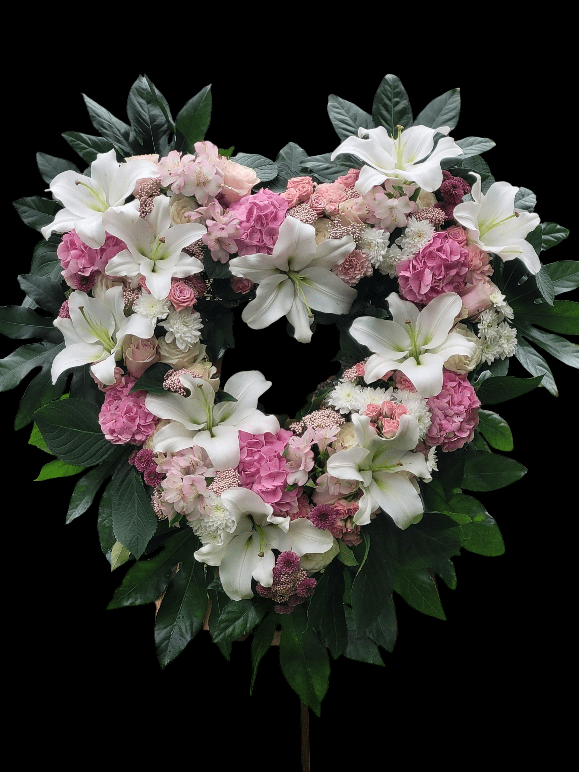 - Wieniec wykonany w biało różowej kolorystyce. Kwiaty użyte w wieńcu to róże, hortensje, lilie i goździki.