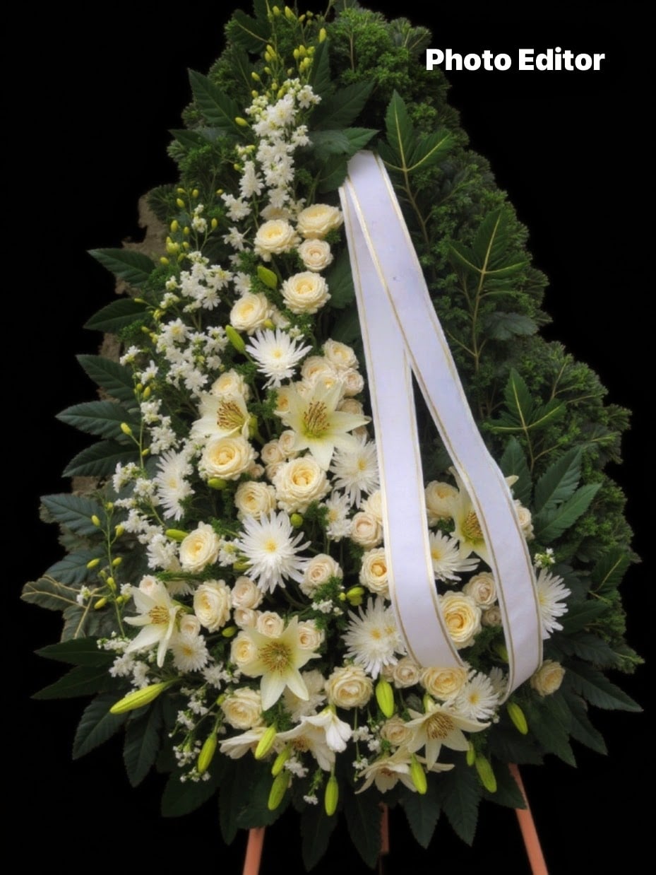 - Wieniec w kolorystyce kremowo-białej. Kwiaty użyte w wieńcu to róże, lilie, astry i storczyki